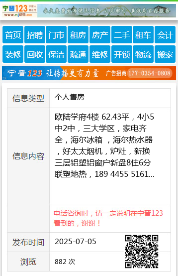 欧陆学府4楼 62.43平,4小5中2中,三大学区,家电齐全,海尔冰箱 ,海尔热水器,好太太烟机,炉灶,新换三层铝塑铝窗户新盘8住6分联塑地热,189 4455 5161 【电话咨询时,请一定说明在望奎信息网看到的,谢谢!】 |