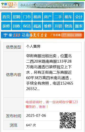 邻街商服出租出卖,位置北二西20米路南商服133平28万南北通透已装修独立上下水,另有正街南二东商服近60平38万高四米南北通透,手续全有房照,电话15246526552 【电话咨询时,请一定说明在望奎信息网看到的,谢谢!】 |