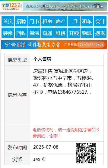 房屋出售 富城北区学区房,紧邻四小五中早市,五楼84.47,价格优惠,格局好不山不顶,电话13846776527