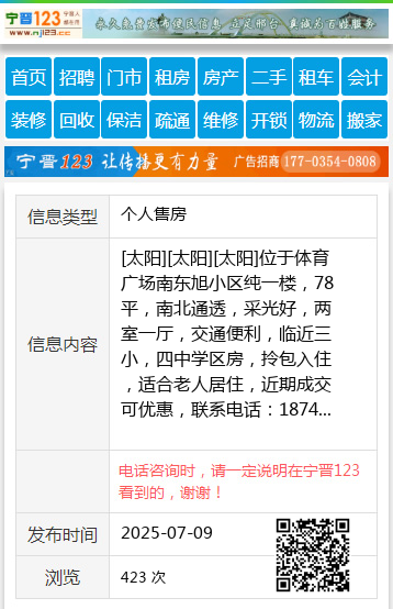 [太阳][太阳][太阳]位于体育广场南东旭小区纯一楼,78平,南北通透,采光好,两室一厅,交通便利,临近三小,四中学区房,拎包入住,适合老人居住,近期成交可优惠,联系电话:1874 【电话咨询时,请一定说明在望奎信息网看到的,谢谢!】 |
