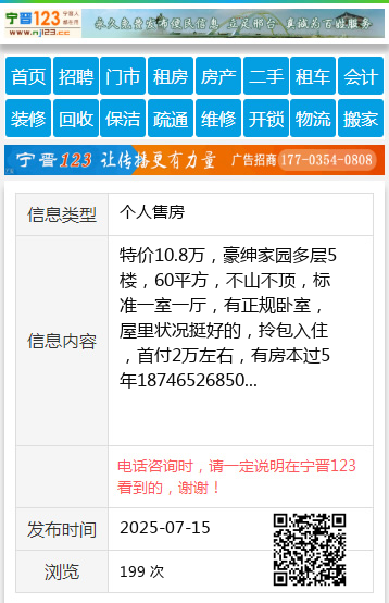特价10.8万,豪绅家园多层5楼,60平方,不山不顶,标准一室一厅,有正规卧室,屋里状况挺好的,拎包入住,首付2万左右,有房本过5年18746526850 【电话咨询时,请一定说明在望奎信息网看到的,谢谢!】 |