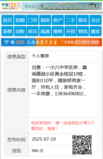 出售:一小六中学区房,鑫城嘉园小区黄金楼层10楼,面积110平,精装修两室一厅,拎包入住,家电齐全,一手房票,13836490002 【电话咨询时,请一定说明在望奎信息网看到的,谢谢!】 |