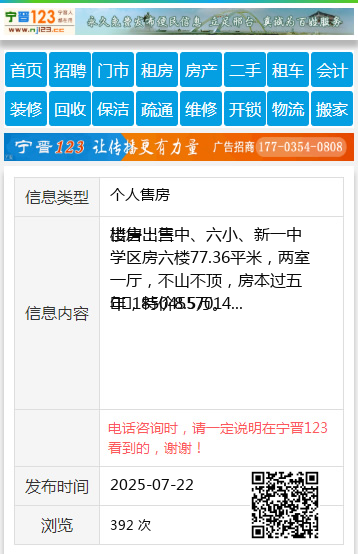 出售:三中、六小、新一中学区房六楼77.36平米,两室一厅,不山不顶,房本过五年,特价8.5万。