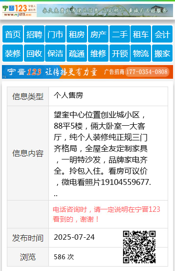 望奎中心位置创业城小区,88平5楼,倆大卧室一大客厅,纯个人装修纯正规三门齐格局,全屋全友定制家具,一明特沙发,品牌家电齐全。拎包入住。看房可议价,微电看照片19104559677 【电话咨询时,请一定说明在望奎信息网看到的,谢谢!】 |