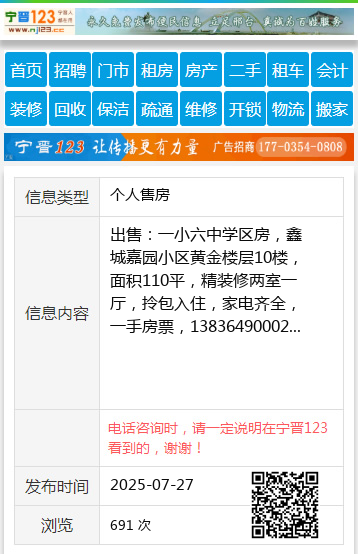 出售:一小六中学区房,鑫城嘉园小区黄金楼层10楼,面积110平,精装修两室一厅,拎包入住,家电齐全,一手房票,13836490002 【电话咨询时,请一定说明在望奎信息网看到的,谢谢!】 |
