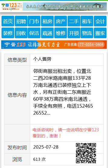 邻街商服出租出卖,位置北二西20米路南商服133平28万南北通透已装修独立上下水,另有正街南二东商服近60平38万高四米南北通透,手续全有房照,电话15246526552 【电话咨询时,请一定说明在望奎信息网看到的,谢谢!】 |
