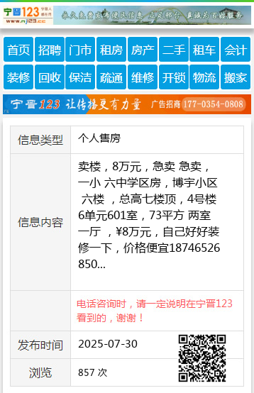 卖楼,8万元,急卖 急卖,一小 六中学区房,博宇小区 六楼 ,总高七楼顶,4号楼 6单元601室,73平方 两室一厅 ,¥8万元,自己好好装修一下,价格便宜18746526850 【电话咨询时,请一定说明在望奎信息网看到的,谢谢!】 |