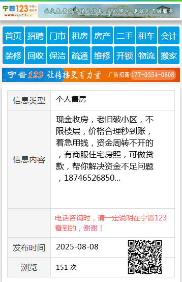 现金收房,老旧破小区,不限楼层,价格合理秒到账,着急用钱,资金周转不开的,有商服住宅房照,可做贷款,帮你解决资金不足问题,18746526850 【电话咨询时,请一定说明在望奎信息网看到的,谢谢!】 |
