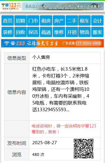 红色小吃车,长3.5米宽1.8米,卡布灯箱3个,2米伸缩展柜,电脑控温炸锅,铁板鸡架锅,还有一个澳柯玛100升冰柜,车内有采暖新,45电瓶,有需要的联系我电话13329455593 【电话咨询时,请一定说明在望奎信息网看到的,谢谢!】 |