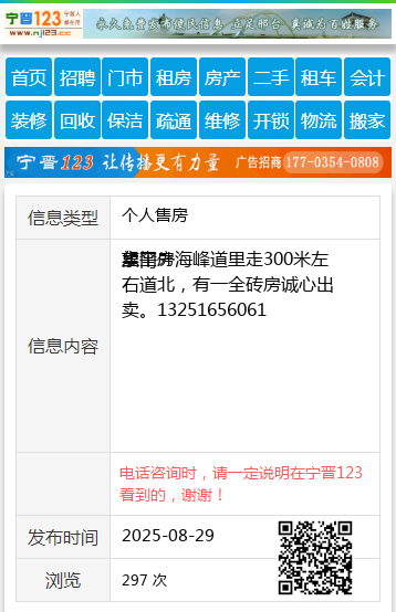 望奎 卖平房 东门外海峰道里走300米左右道北,有一全砖房诚心出卖。13251656061