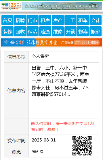 出售:三中、六小、新一中学区房六楼77.36平米,两室一厅,不山不顶,去年新装修未入住,房本过五年,7.5万不讲价。