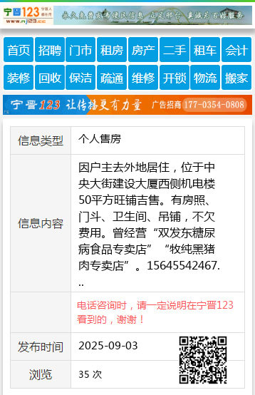 因户主去外地居住,位于中央大街建设大厦西侧机电楼50平方旺铺吉售。有房照、门斗、卫生间、吊铺,不欠费用。曾经营“双发东糖尿病食品专卖店”“牧纯黑猪肉专卖店”。15645542467 【电话咨询时,请一定说明在望奎信息网看到的,谢谢!】 |
