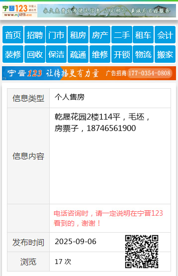 乾程花园2楼毛坯,114平,不把山,独立下水,房票子18846595180