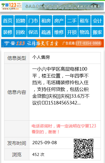 一小六中学区高层电梯100平,楼王位置,一年四季不挡光,毛坯精装修拎包入住,支持任何贷款,包括公积金贷款[庆祝][庆祝]33.6万不议价☎️15184565342 【电话咨询时,请一定说明在望奎信息网看到的,谢谢!】 |