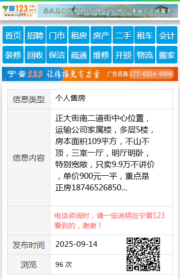 正大街南二道街中心位置,运输公司家属楼,多层5楼,房本面积109平方,不山不顶,三室一厅,明厅明卧,特别宽敞,只卖9.9万不讲价,单价900元一平,重点是正房18746526850 【电话咨询时,请一定说明在望奎信息网看到的,谢谢!】 |