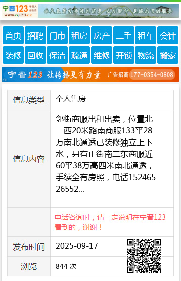 邻街商服出租出卖,位置北二西20米路南商服133平28万南北通透已装修独立上下水,另有正街南二东商服近60平38万高四米南北通透,手续全有房照,电话15246526552 【电话咨询时,请一定说明在望奎信息网看到的,谢谢!】 |