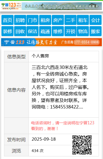 三百北六西走30米左右道北,有一全砖房诚心急卖。房屋状况良好,证照齐全,本人名下。购买后,过户省事。另外,也可以用楼房或车库换,望有意者及时联系。详询微电:15845538422. 【电话咨询时,请一定说明在望奎信息网看到的,谢谢!】 |