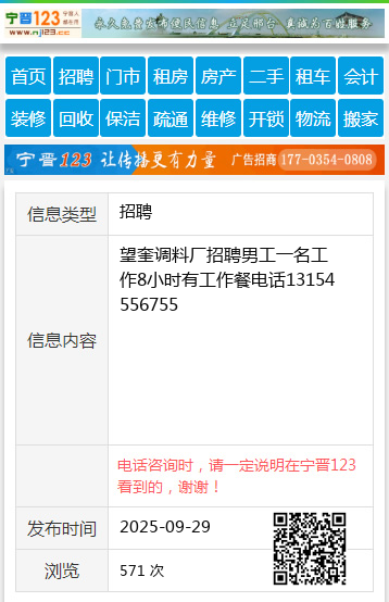 望奎调料厂招聘男工一名工作8小时有工作餐电话13154556755