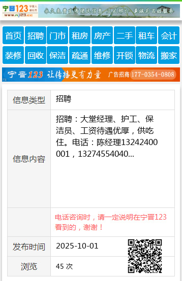 招聘:大堂经理、护工、保洁员、工资待遇优厚,供吃住。电话:陈经理13242400001,13274554040
