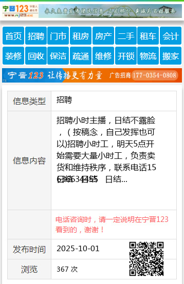 招聘小时主播,日结不露脸,(按稿念,自己发挥也可以)招聘小时工,明天5点开始需要大量小时工,负责卖货和维持秩序,联系电话15636634455