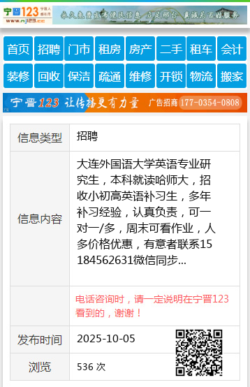 大连外国语大学英语专业研究生,本科就读哈师大,招收小初高英语补习生,多年补习经验,认真负责,可一对一/多,周末可看作业,人多价格优惠,有意者联系15184562631微信同步 【电话咨询时,请一定说明在望奎信息网看到的,谢谢!】 |