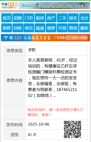 本人是育婴师,41岁,经过培训的,有健康证乙肝五项检测幽门螺旋杆菌检测证书,现在想找一大一点的宝宝带,会做辅食,会做饭,有意者与我联系,18746521102(加微信) 【电话咨询时,请一定说明在望奎信息网看到的,谢谢!】 |