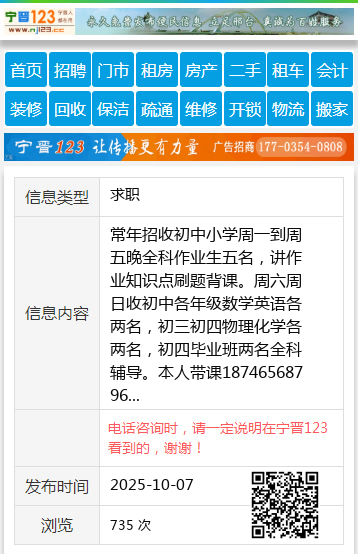 常年招收初中小学周一到周五晚全科作业生五名,讲作业知识点刷题背课。周六周日收初中各年级数学英语各两名,初三初四物理化学各两名,初四毕业班两名全科辅导。本人带课18746568796 【电话咨询时,请一定说明在望奎信息网看到的,谢谢!】 |