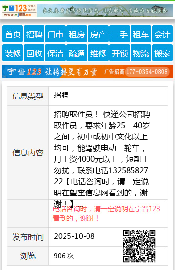 | 防骗提醒: | 望奎信息网(www.wangkui.cc)提醒您:手工活、网络兼职、刷单,都是骗子!凡以各种名义收取费用的都是骗子!找工作是往兜里挣钱,让你往外掏钱的都是骗子!异地招聘请提高警惕,谨防诈骗! |