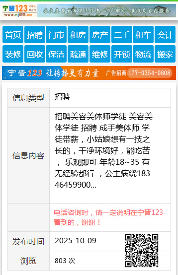 招聘美容美体师学徒 美容美体学徒 招聘 成手美体师 学徒带薪,小姑娘想有一技之长的,干净环境好,能吃苦, 乐观即可 年龄18~35 有无经验都行 ,公主病绕18346459900