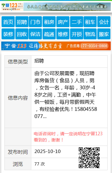 由于公司发展需要,现招聘库房备货(食品)人员,男,女各一名,年龄,30岁-48岁之间,工资+满勤,中午供一顿饭,每月带薪假两天,有经验者优先!15804558077 【电话咨询时,请一定说明在望奎信息网看到的,谢谢!】 |