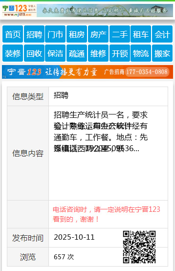 招聘生产统计员一名,要求会计专业,有生产统计经 验,熟练运用办公软件,有通勤车,工作餐。地点:先锋镇以西两公里,联 系电话:19204509536