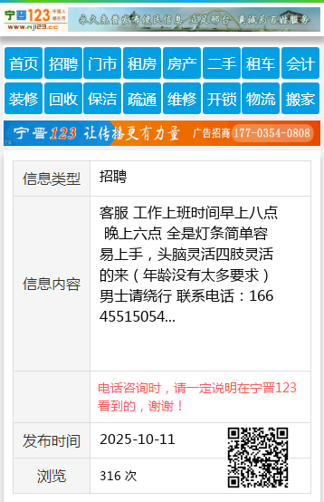 客服 工作上班时间早上八点 晚上六点 全是灯条简单容易上手,头脑灵活四肢灵活的来(年龄没有太多要求) 男士请绕行 联系电话:16645515054 【电话咨询时,请一定说明在望奎信息网看到的,谢谢!】 |