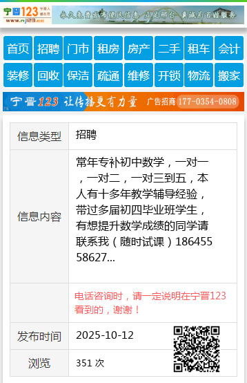 常年专补初中数学,一对一,一对二,一对三到五,本人有十多年教学辅导经验,带过多届初四毕业班学生,有想提升数学成绩的同学请联系我(随时试课)18645558627