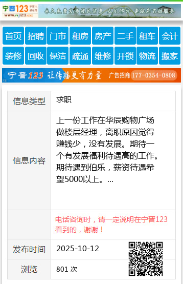 上一份工作在华辰购物广场做楼层经理,离职原因觉得赚钱少,没有发展。期待一个有发展福利待遇高的工作。期待遇到伯乐,薪资待遇希望5000以上。 【电话咨询时,请一定说明在望奎信息网看到的,谢谢!】 |