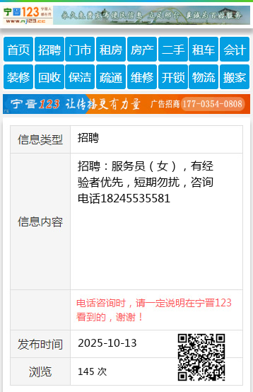 招聘:服务员(女),有经验者优先,短期勿扰,咨询电话18245535581