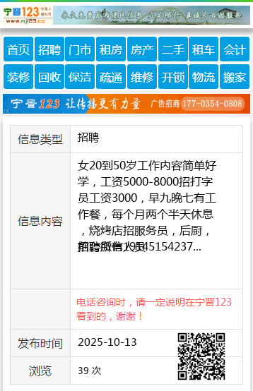 女20到50岁工作内容简单好学,工资5000-8000招打字员工资3000,早九晚七有工作餐,每个月两个半天休息,烧烤店招服务员,后厨,前台所有人员
