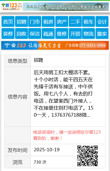 后天用男工扣大棚活不累。十个小时活,能干四五天在先锋干活有车接送,中午供饭。用七八个人,有去的打电话,在望奎西门外接人,不在接里住别打电话了。150一天,13763767188微 【电话咨询时,请一定说明在望奎信息网看到的,谢谢!】 |