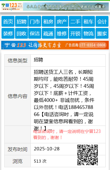 招聘送货工人三名,长期短期均可,能吃苦耐劳!45周岁以下,45周岁以下!45周岁以下!底薪+计件工资,最低4000+ 非诚勿扰,条件以外勿扰!电话18846578866 【电话咨询时,请一定说明在望奎信息网看到的,谢谢!】 |