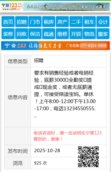 要求有销售经验或者电销经验,底薪3000➕全勤奖➕提成➕现金奖,或者无底薪通提,可接受陪读宝妈。单休!上午8:00-12:00下午13.00-17:00,电话13234550555 【电话咨询时,请一定说明在望奎信息网看到的,谢谢!】 |