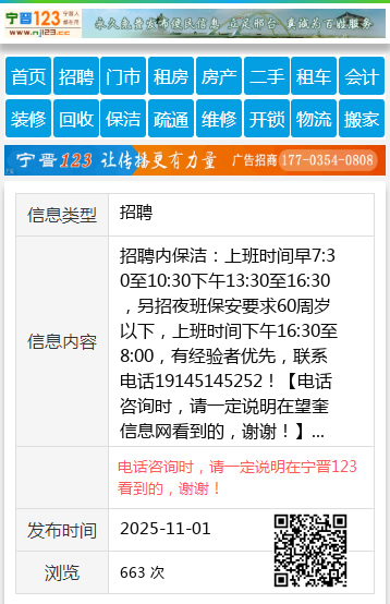 招聘内保洁:上班时间早7:30至10:30下午13:30至16:30,另招夜班保安要求60周岁以下,上班时间下午16:30至8:00,有经验者优先,联系电话19145145252! 【电话咨询时,请一定说明在望奎信息网看到的,谢谢!】 |