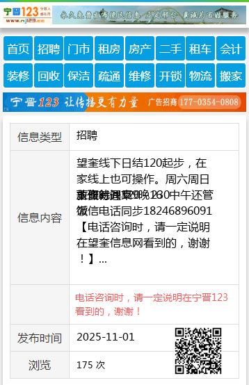 | 防骗提醒: | 望奎信息网(www.wangkui.cc)提醒您:手工活、网络兼职、刷单,都是骗子!凡以各种名义收取费用的都是骗子!找工作是往兜里挣钱,让你往外掏钱的都是骗子!异地招聘请提高警惕,谨防诈骗! |