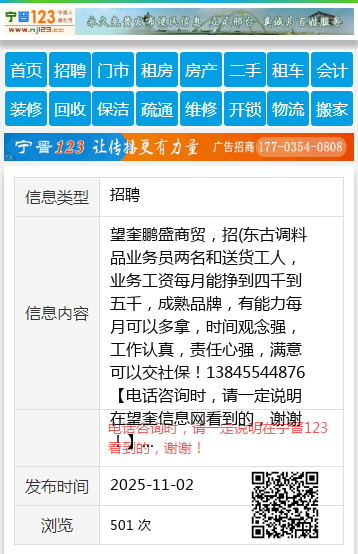 望奎鹏盛商贸,招(东古调料品业务员两名和送货工人,业务工资每月能挣到四千到五千,成熟品牌,有能力每月可以多拿,时间观念强,工作认真,责任心强,满意可以交社保!13845544876 【电话咨询时,请一定说明在望奎信息网看到的,谢谢!】 |
