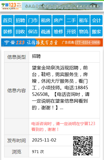 望奎金坳泉洗浴现招聘,前台,鞋吧,男宾服务生,房嫂,休闲大厅服务员,看门工,小项技师。电话:18845526508。