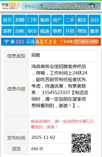 鸿淼商务会馆招聘客房吧员,房嫂,工作时间上24休24,能吃苦耐劳有经验者优先考虑,待遇优厚,有意者联系: 15545523337 【电话咨询时,请一定说明在望奎信息网看到的,谢谢!】 |