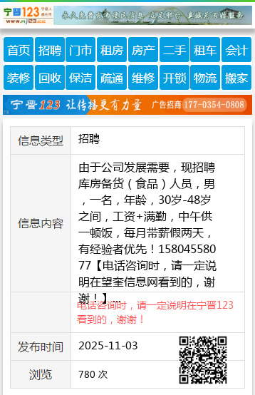 由于公司发展需要,现招聘库房备货(食品)人员,男,一名,年龄,30岁-48岁之间,工资+满勤,中午供一顿饭,每月带薪假两天,有经验者优先!15804558077 【电话咨询时,请一定说明在望奎信息网看到的,谢谢!】 |