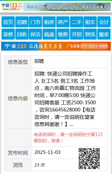 招聘: 快递公司招聘操作工人 女工5名 男工3名 工作地点,南六街嘉汇物流园 工作时间,早7:00晚5:00 快递公司招聘客服 工资2500-3500,咨询16645628000 【电话咨询时,请一定说明在望奎信息网看到的,谢谢!】 |