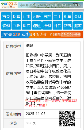 招收初中小学周一到周五晚上需全科作业辅导学生,讲知识点刷题背小四门。周六周日补初中各年级数理化英,均为小班四名授课。初四收两名需全科辅导到中考的学生。本人带课18746568796 【电话咨询时,请一定说明在望奎信息网看到的,谢谢!】 |
