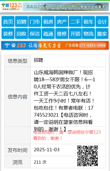 山东威海韩国辣椒厂!现招聘18—58岁男女不限!6—10人经常干农活的优先,计件工资一天二百七八左右!一天工作9小时!常年有活!包吃包住!有意者电联:17745523021 【电话咨询时,请一定说明在望奎信息网看到的,谢谢!】 |