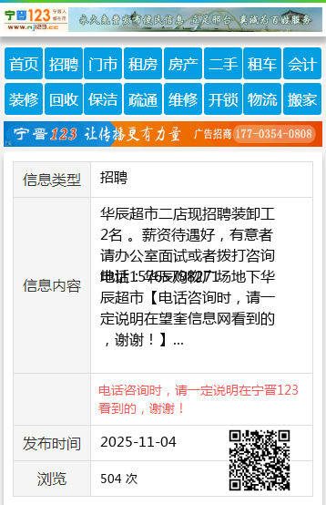 华辰超市二店现招聘装卸工2名 。薪资待遇好,有意者请办公室面试或者拨打咨询电话15765798271