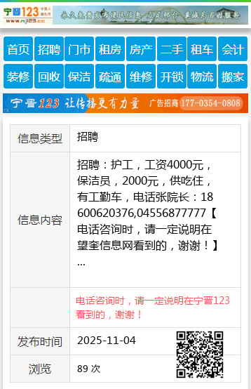 招聘:护工,工资4000元,保洁员,2000元,供吃住,有工勤车,电话张院长:18600620376,04556877777 【电话咨询时,请一定说明在望奎信息网看到的,谢谢!】 |